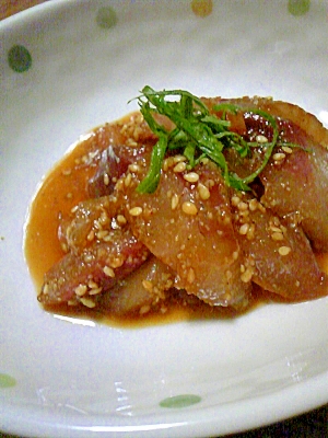 作り方 さばは皮・骨・血合いを取りのぞき、一口大の薄切りにします。 小ねぎは小口切り、のりは細切りにします。 ボウルにしょうゆ・酒・みりん・白すりごまを入れて混ぜ合わせ、(1)を和えます。 器に盛り、(2)をのせ、白ごまをふります。 たれはわさび・おろししょうがなどを加えてもよいでしょう。 ごはんにのせて丼物にしたり、だし汁をかけてごまさばの竜田揚げ エネルギー 175 kcal 食塩相当量 08 g HIROマンマさんのレシピ 30分以内 ご飯によく合う一品です。 ごまさばの脂質は、真さばの約3割と低く、さっぱりとしています。 脂質